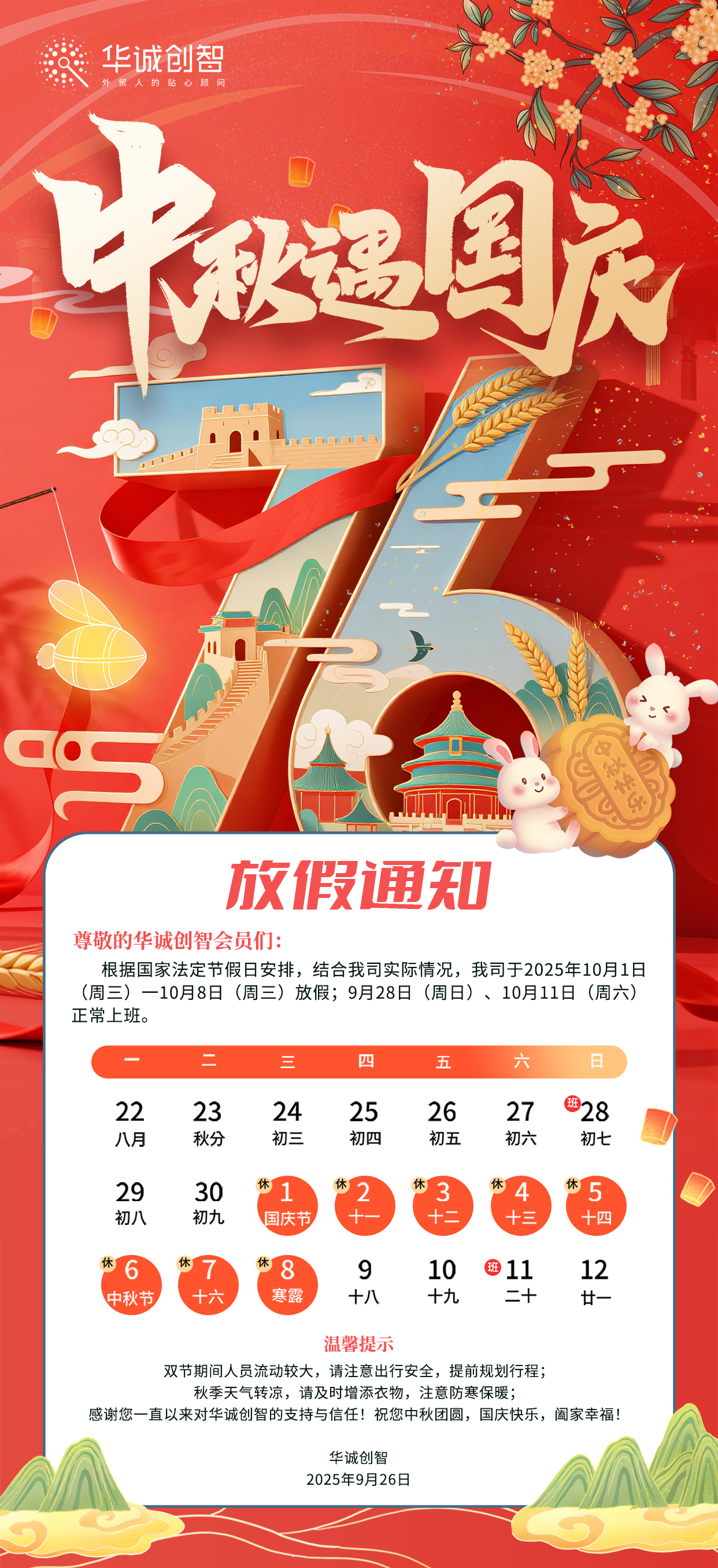 感謝您一直以來對(duì)華誠(chéng)創(chuàng)智的支持與信任!祝您中秋團(tuán)圓,國(guó)慶快樂,闔家幸福!